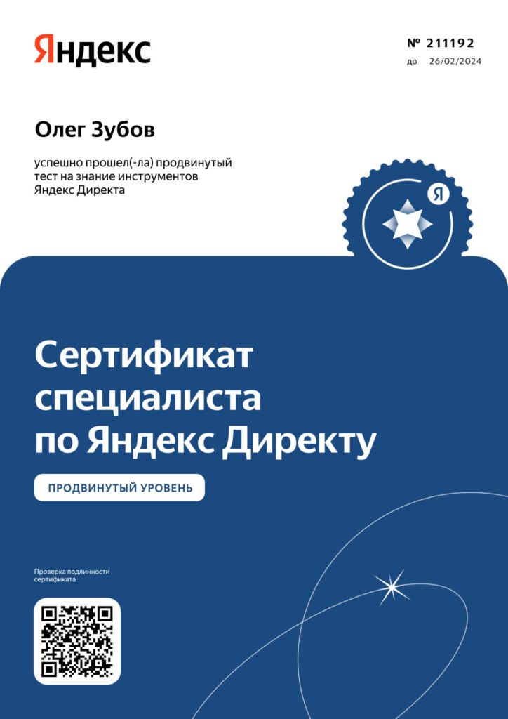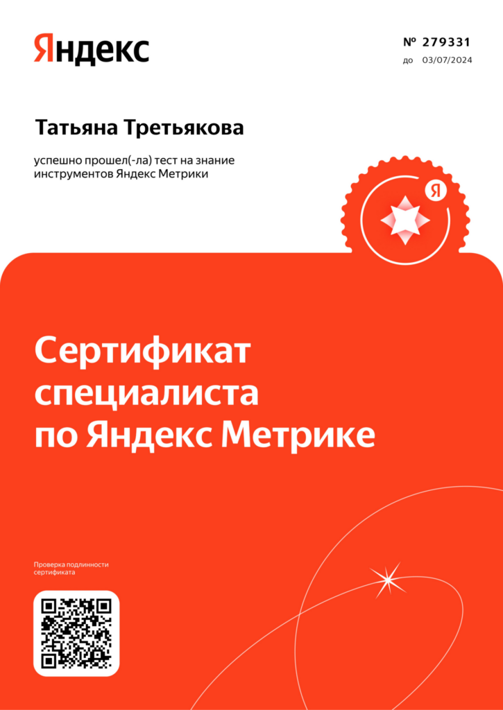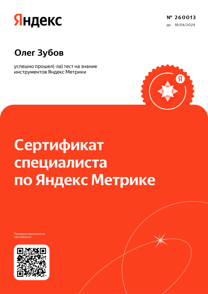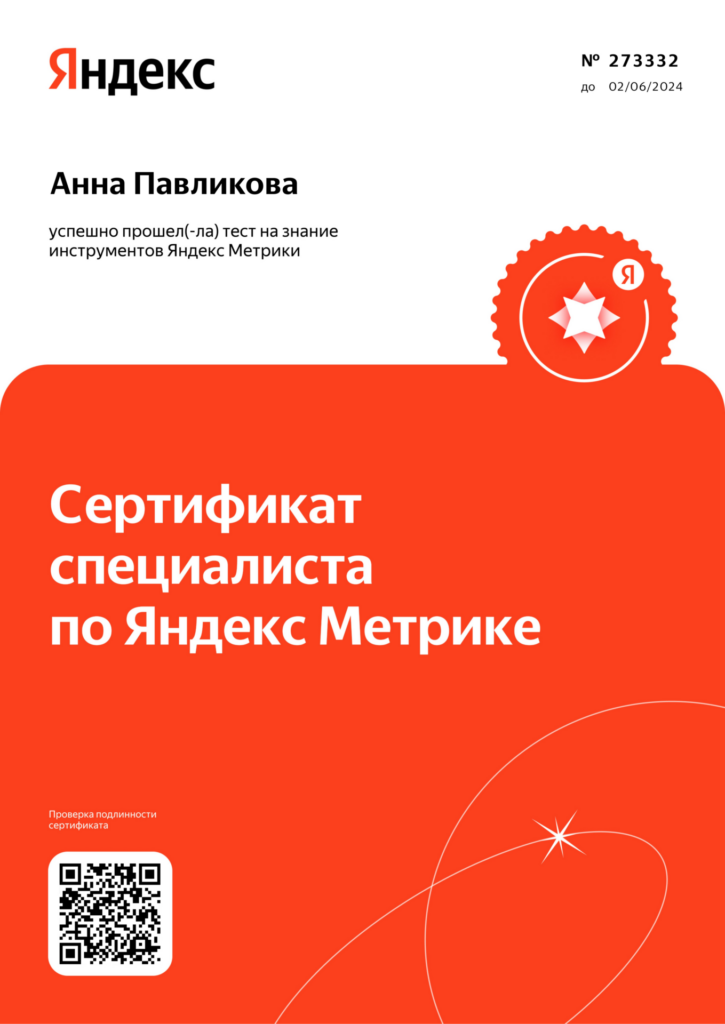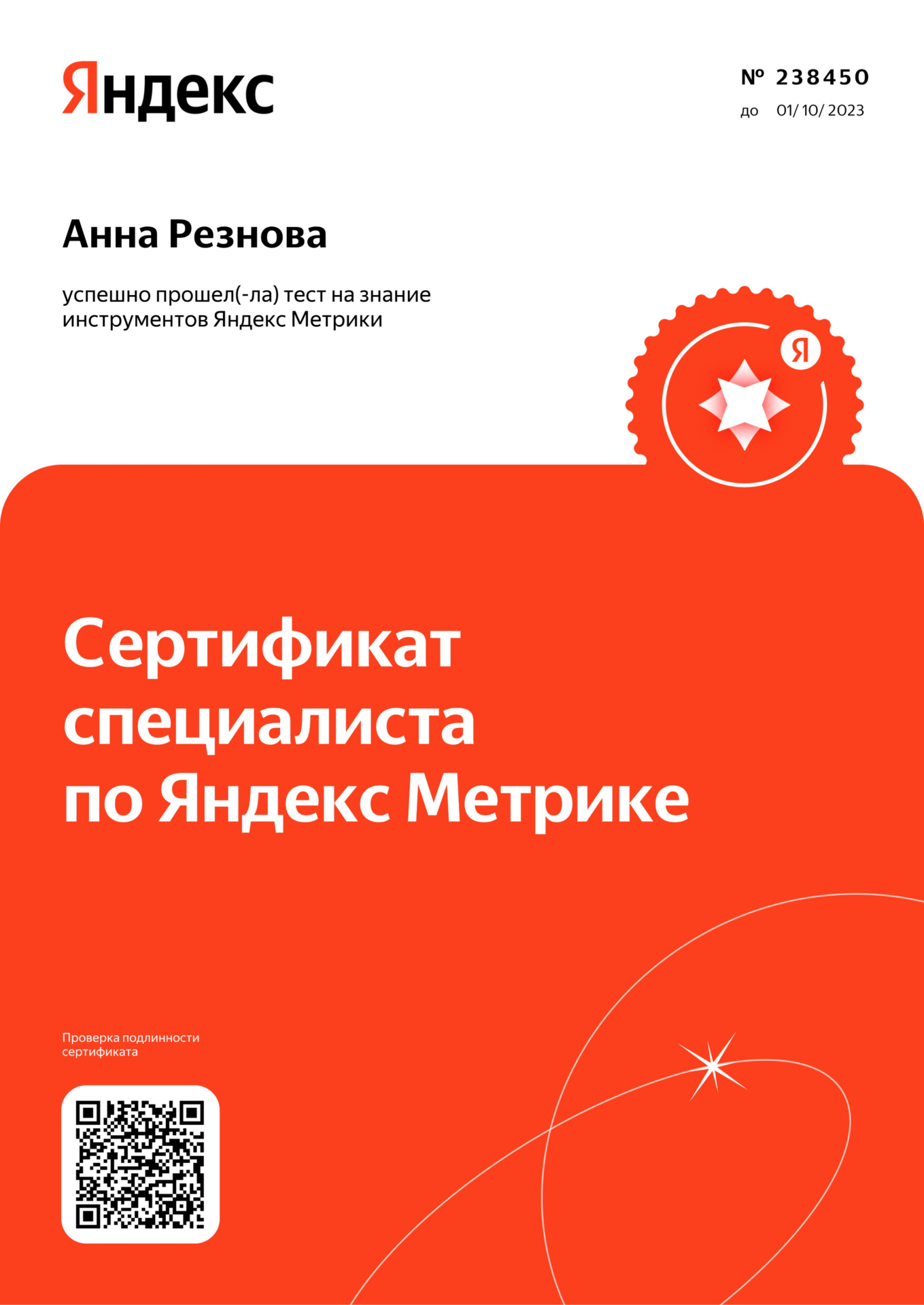 • Сертифицированный специалист по Яндекс.Директу и Яндекс.Метрике