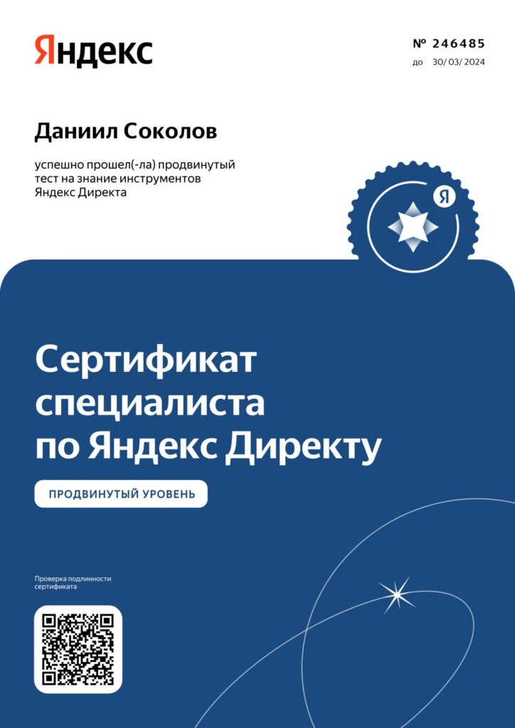 У всех наших специалистов по контекстной рекламе есть сертификат специалиста по Яндекс Директу и Яндекс Метрике